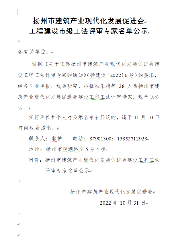 扬州市建筑产业现代化发展促进会工程建设市级工法评审专家名单公示