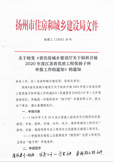 关于转发省住房城乡建设厅 组织开展2020年度江苏省优质工程奖扬子杯申报工作的通知