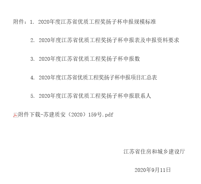 省住房城乡建设厅关于组织开展2020年度江苏省优质工程奖扬子杯申报工作的通知及所有附件: