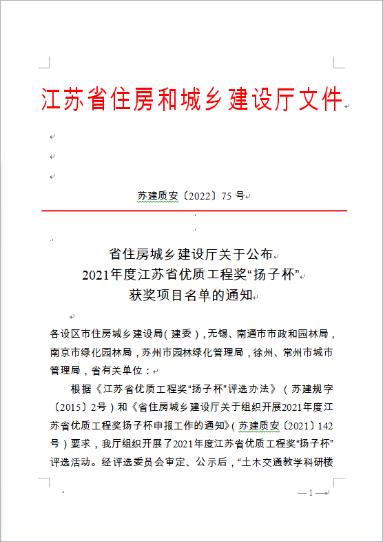 省住房城乡建设厅关于公布 2021年度江苏省优质工程奖“扬子杯” 获奖项目名单的通知