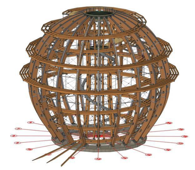 项目在诸多方面都表现出目前的最高水准,例如超过500吨的重量、40米的高度和50米的球形直径。这些数据都使得该装置在极远处就可以被人所察觉。此外,该项目还使用了627立方米的胶合层压木材、190吨的钢制部件、40000个螺丝、18000个螺栓、3300平方米的砌面板和2200米的栏杆。而这些还都仅仅只是该项目的冰山一角。
