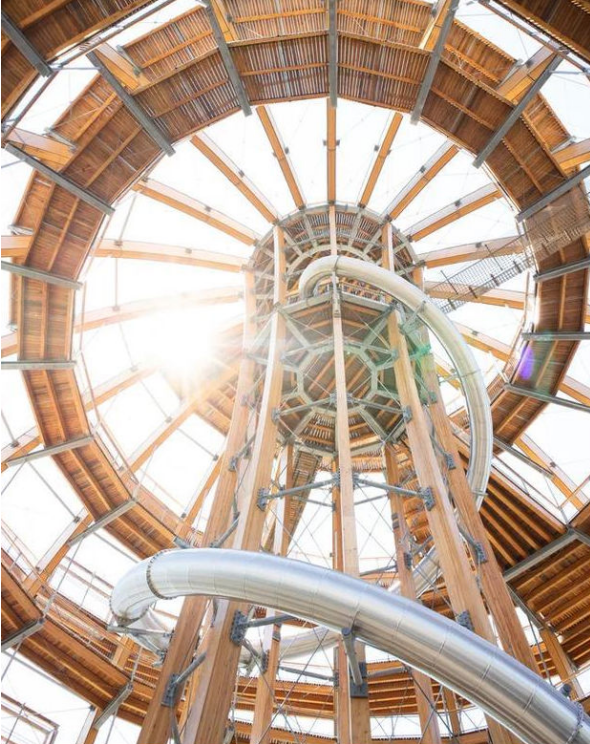 作为一件工程学上的杰作,球体于2019年在德国滨湖施泰因贝格正式对外开放。这个木球是目前世界上最大的可于内部行走的木制球形装置,由inMotion Park Seenland GmbH投资建造,内部最多可容纳950人。