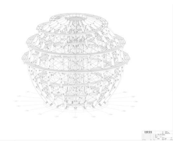 该木球外部的结构元素长约55米,并含有15米的拱形雕刻部分。正因为该装置复杂的结构设计,建筑师在一开始就和业主Almholz以及相应的合作商制定了全面而富有逻辑的组装方案。所有的装置零部件都是在Kleinheubach的工厂提前加工制作完成的,每个部件的重量大致都是17吨。等这些部件被送到装配现场后,工人们就会根据事先制定好的方案,将其依次组装。