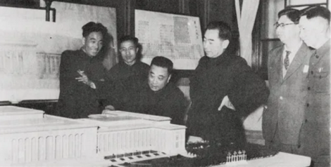 原北京市规划管理局设计院总建筑师张镈为周恩来总理讲解人民大会堂方案。