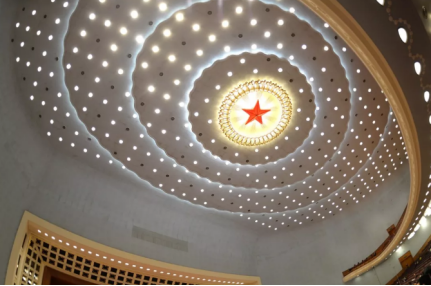 在大会堂施工过程中,有人提出,万人大礼堂层高过高,显得人很渺小,但观众席的两层挑台又使人感到压抑。这个看似矛盾的技术难题被周总理用一句王勃的名句点破:“落霞与孤鹜齐飞,秋水共长天一色。”在周总理的启发下,设计师把顶棚做成象征天体空间的大穹隆形,与墙身交接处则由直线改为圆角,形成了浑然一体的效果。穹顶上,三层水波形的暗灯槽围绕着红五角星,500个灯孔点缀其间,观众一抬头就可见繁星点点,丝毫不会感到生硬和压抑。