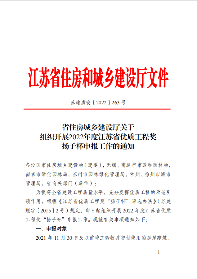 〔2023〕19号省住房城乡建设厅关于组织开展2022年度江苏省优质工程奖扬子杯申报工作的通知