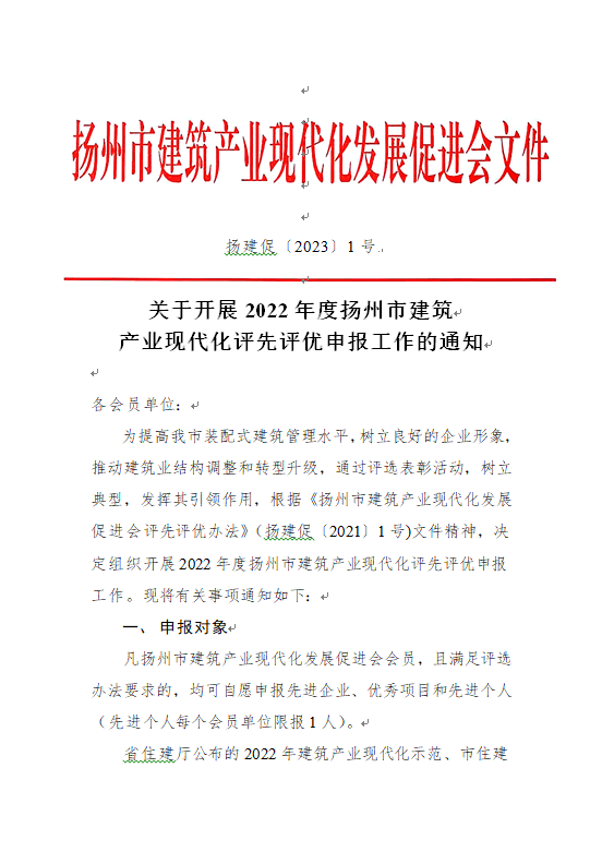 关于开展2022年度扬州市建筑 产业现代化评先评优申报工作的通知