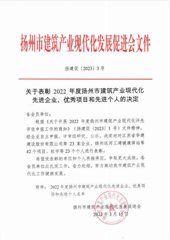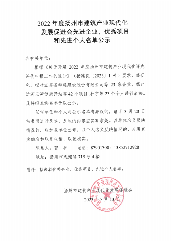2022年度扬州市建筑产业现代化 发展促进会先进企业、优秀项目和先进个人名单公示