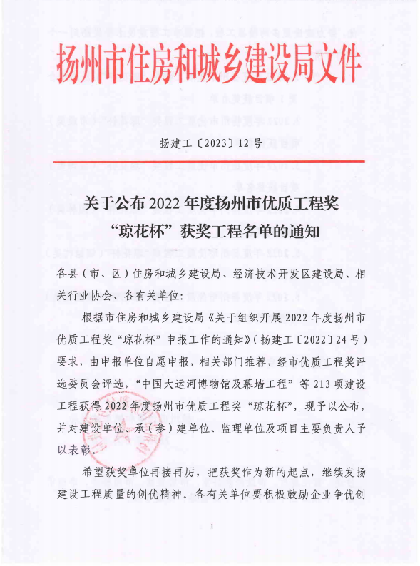 关于公布2022年度扬州市优质工奖“琼花杯”获奖工程名单的通知