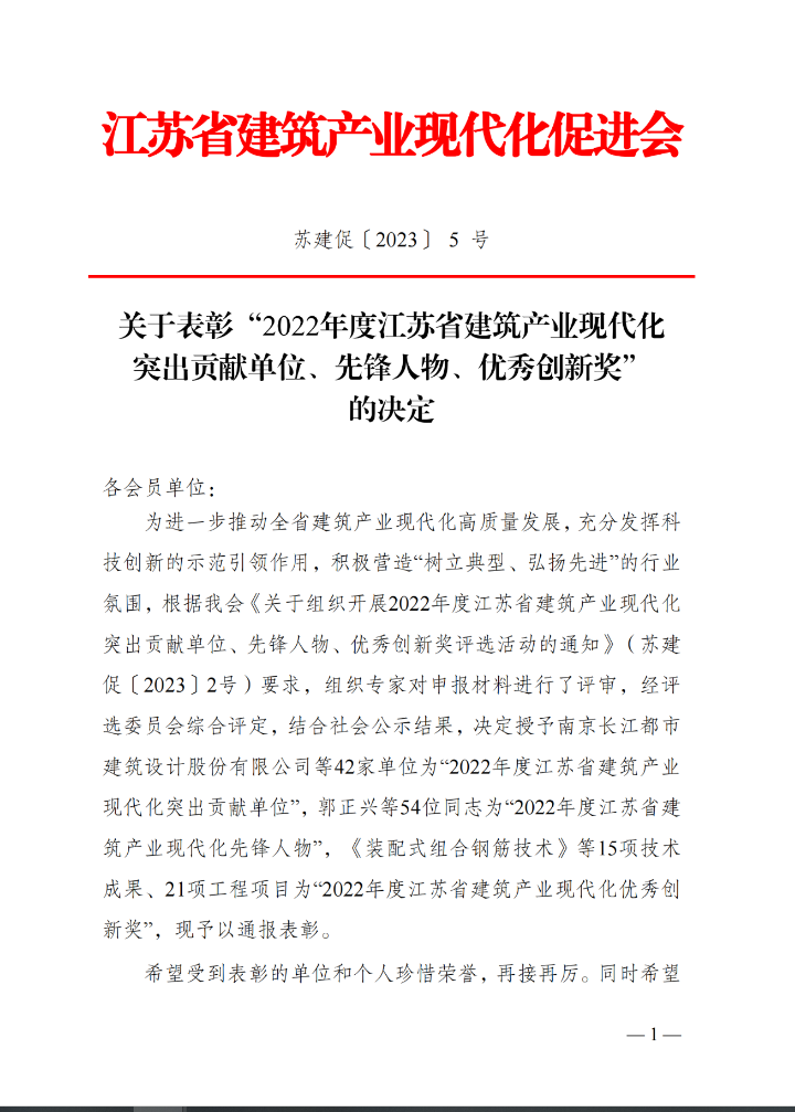 关于表彰“2022年度江苏省建筑产业现代化突出贡献单位、先锋人物、优秀创新奖”的决定