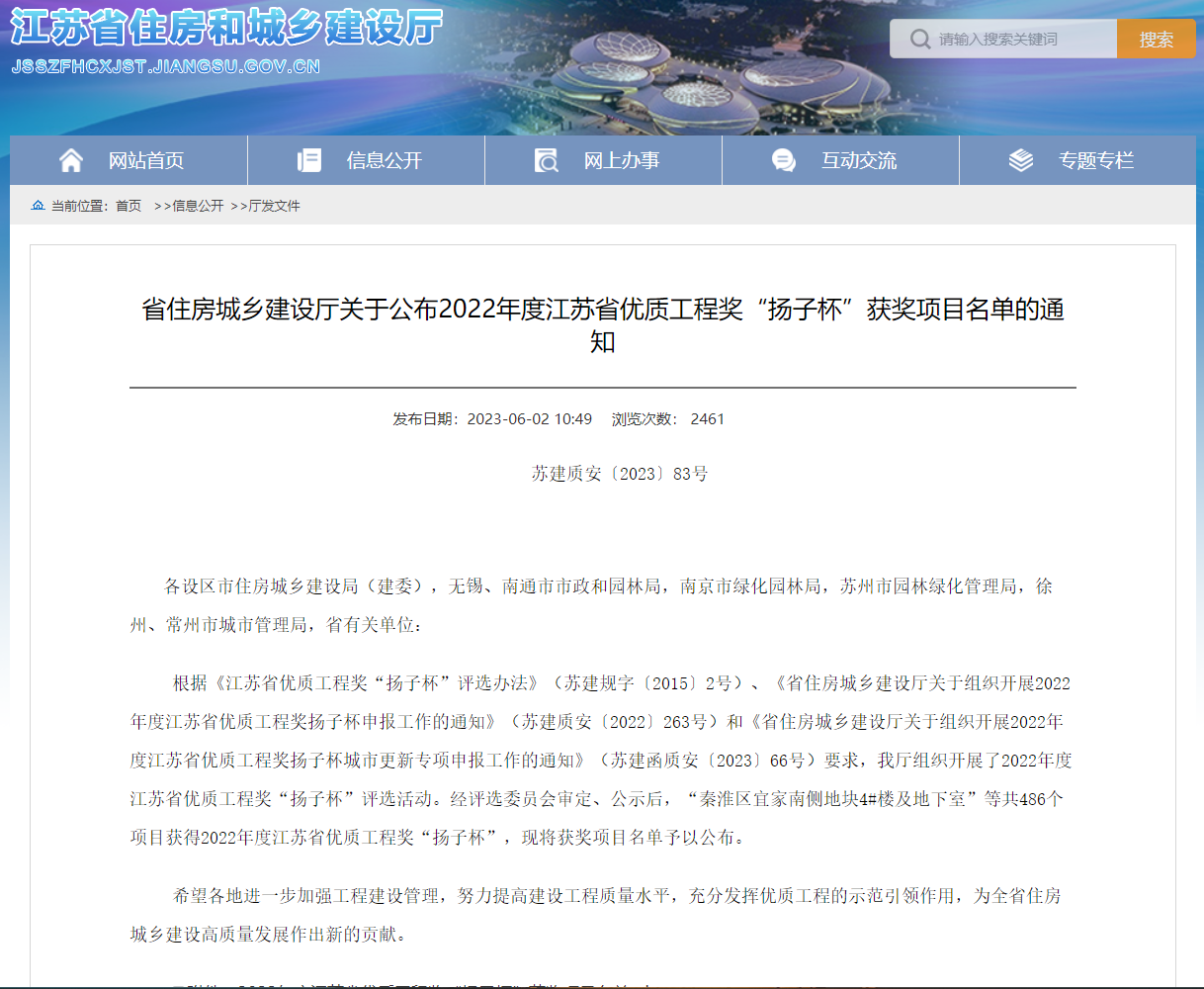 省住房城乡建设厅关于公布2022年度江苏省优质工程奖“扬子杯”获奖项目名单的通知