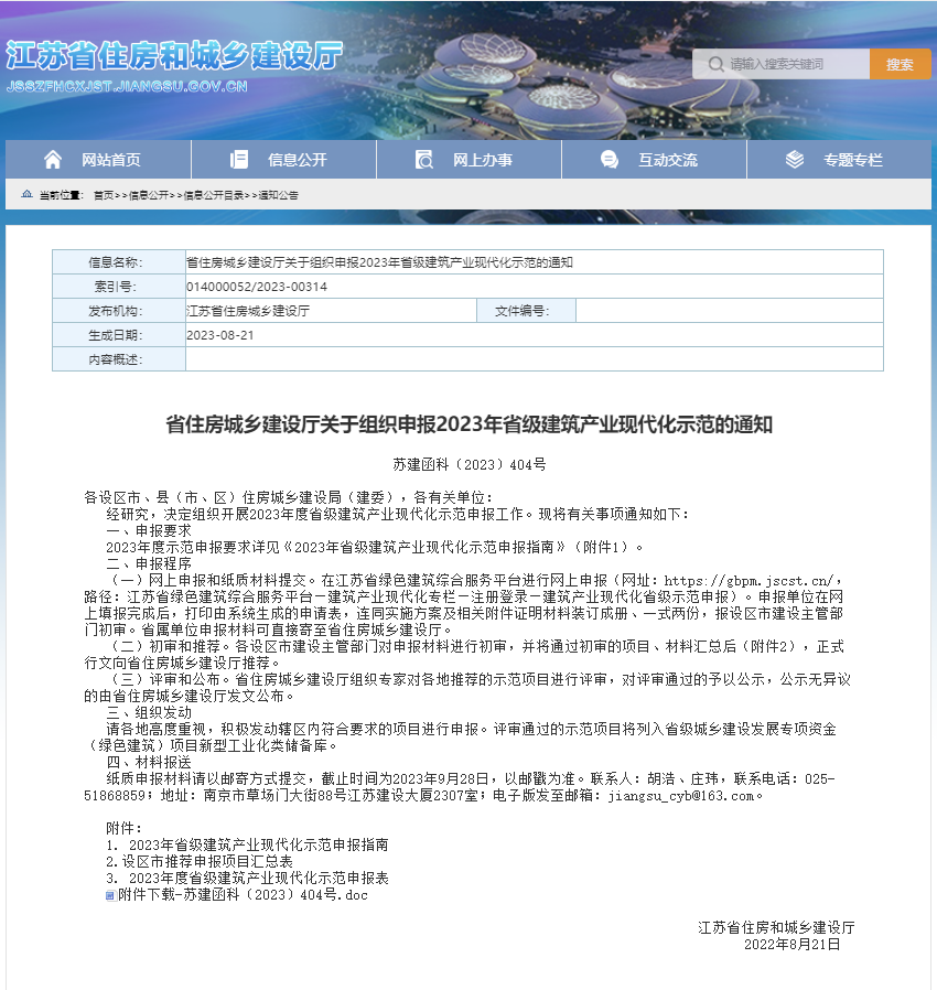 省住房城乡建设厅关于组织申报2023年省级建筑产业现代化示范的通知