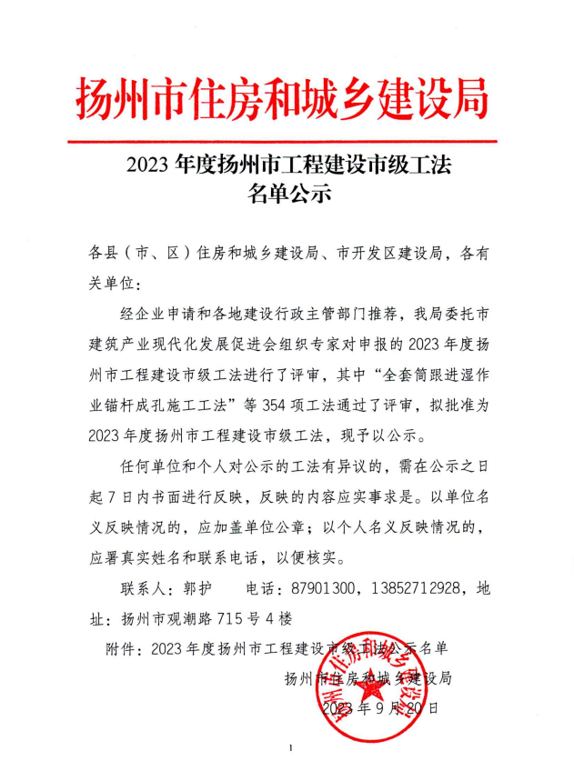 转发省厅2023年度江苏省工程建设省级 工法申报暨开展2023年度扬州市工程建设市级工法申报工作的通知