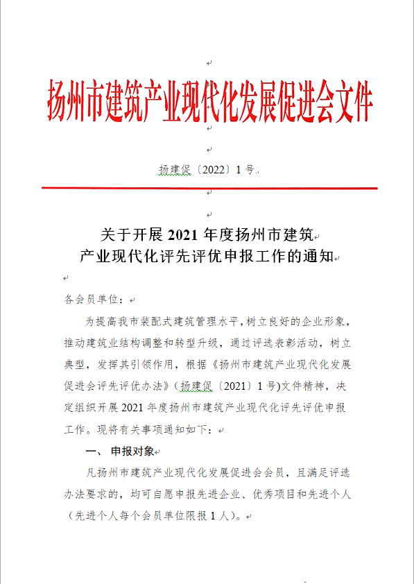 关于开展2021年度扬州市建筑产业现代化评先评优申报工作的通知