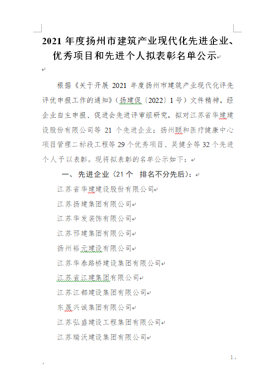2021年度扬州市建筑产业现代化先进企业、优秀项目和先进个人拟表彰名单公示