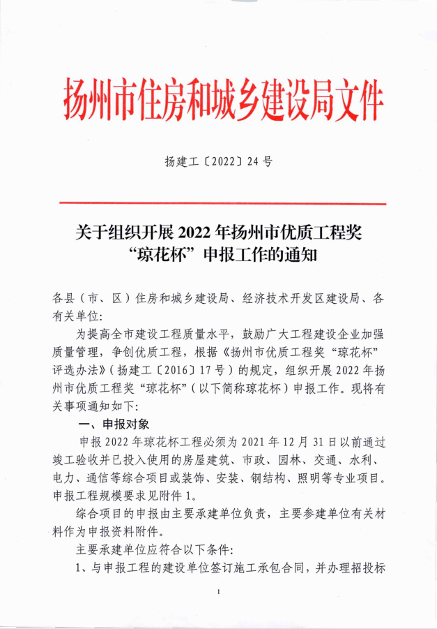 关于组织开展2022年扬州市优质工程奖 “琼花杯”申报工作的通知