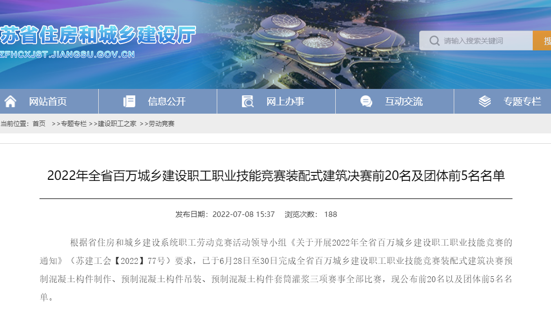 关于 2022 年江苏省百万城乡建设职工 职业技能竞赛结果的通报