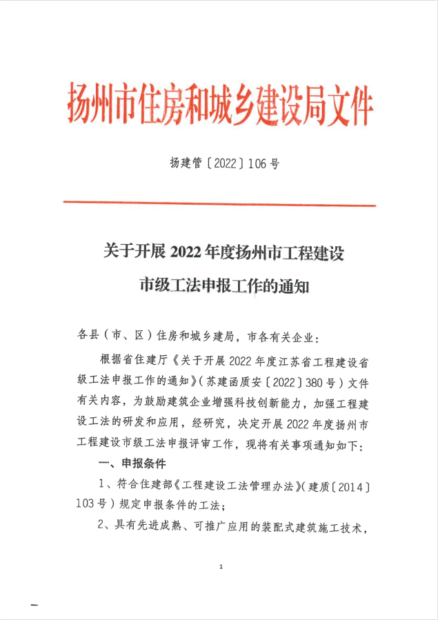 关于开展2022年度扬州市工程建设市级工法申报工作的通知