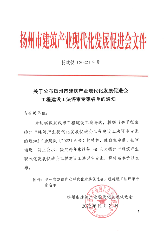 关于公布扬州市建筑产业现代化发展促进会工程建设工法评审专家名单的通知