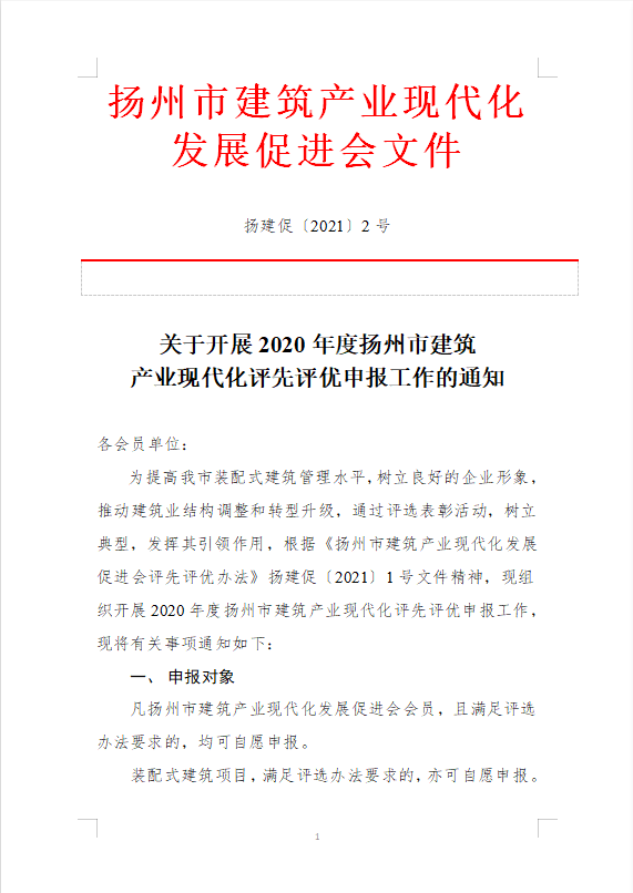 关于开展2020年度扬州市建筑产业现代化评先评优申报工作的通知