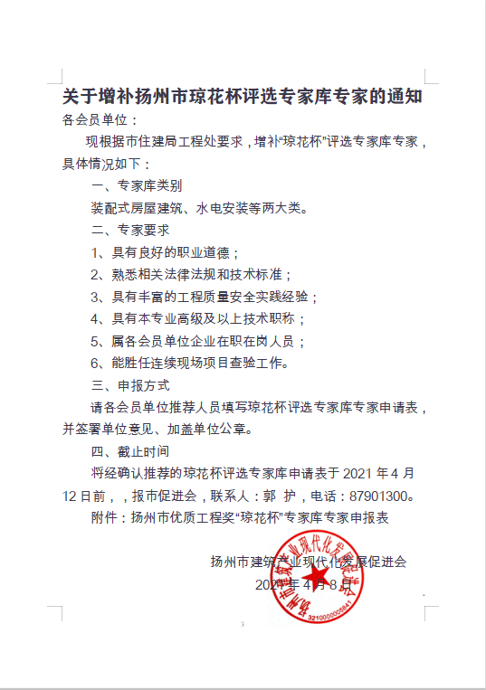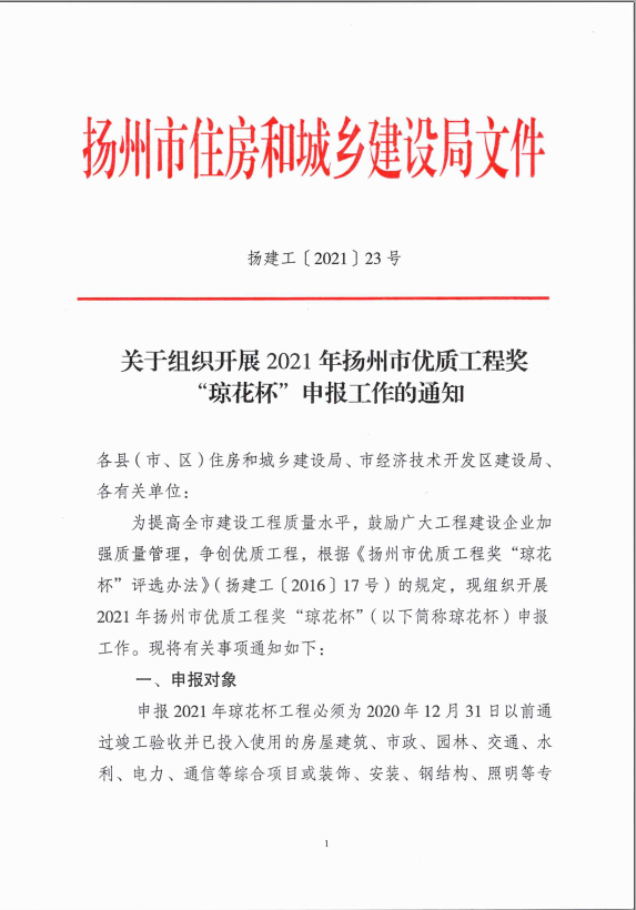 关于组织开展2021年扬州市优质工程奖“琼花杯”申报工作的通知