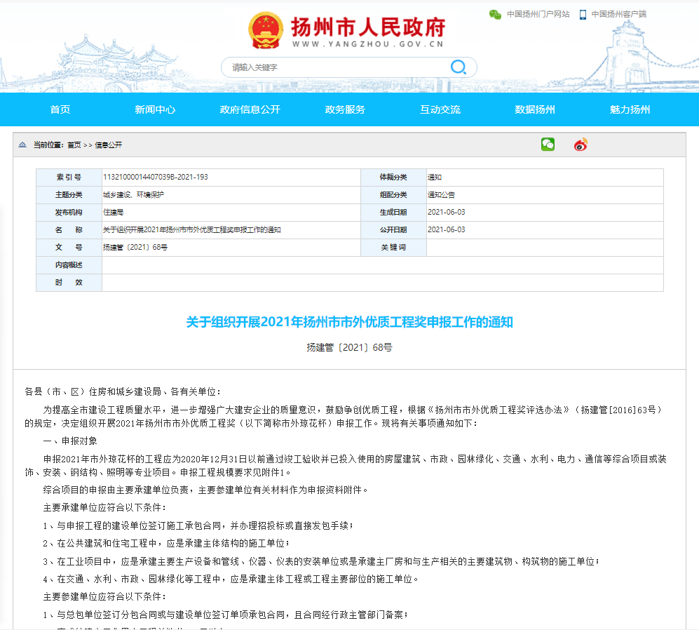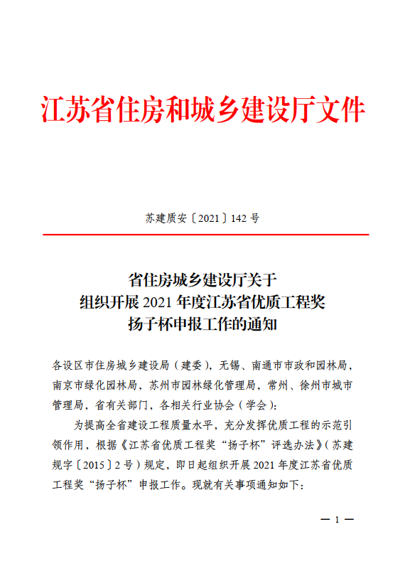 江东省住建厅“关于组织开展2021年度江苏省优质工程奖‘扬子杯’申报工作”的通知