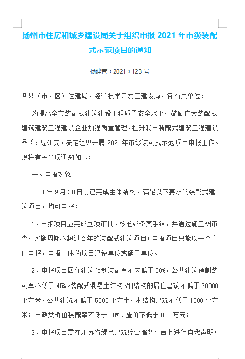转发:扬州市住房和城乡建设局关于组织申报2021年市级装配式示范项目的通知