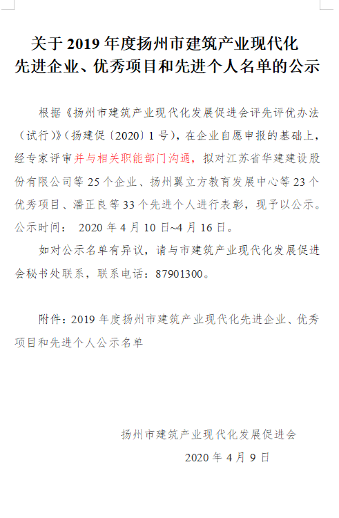 关于2019年度扬州市建筑产业现代化先进企业、优秀项目和先进个人名单的公示