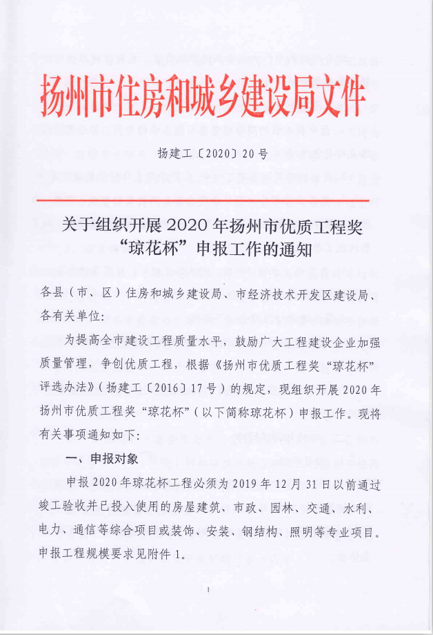 关于组织开展2020年扬州市优质工程奖“琼花杯”申报工作的通知