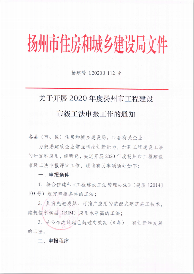 关于开展2020年度扬州市工程建设市级工法申报工作的通知