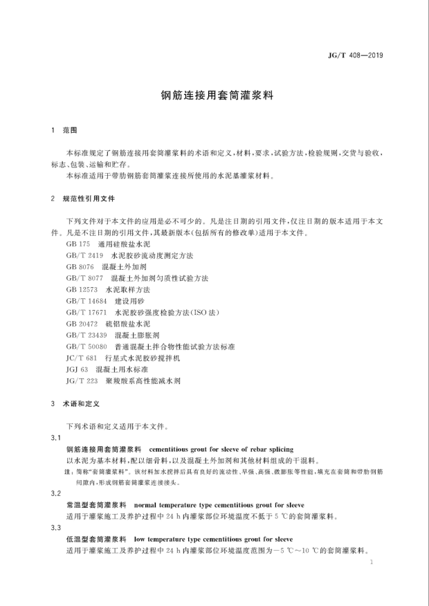 现批准《钢筋连接用套筒灌浆料》为建筑工业行业产品标准,编号为JG/T408-2019,自2020年6月1日起实施。原《钢筋连接用套筒灌浆料》(JG/T408-2013)同时废止。