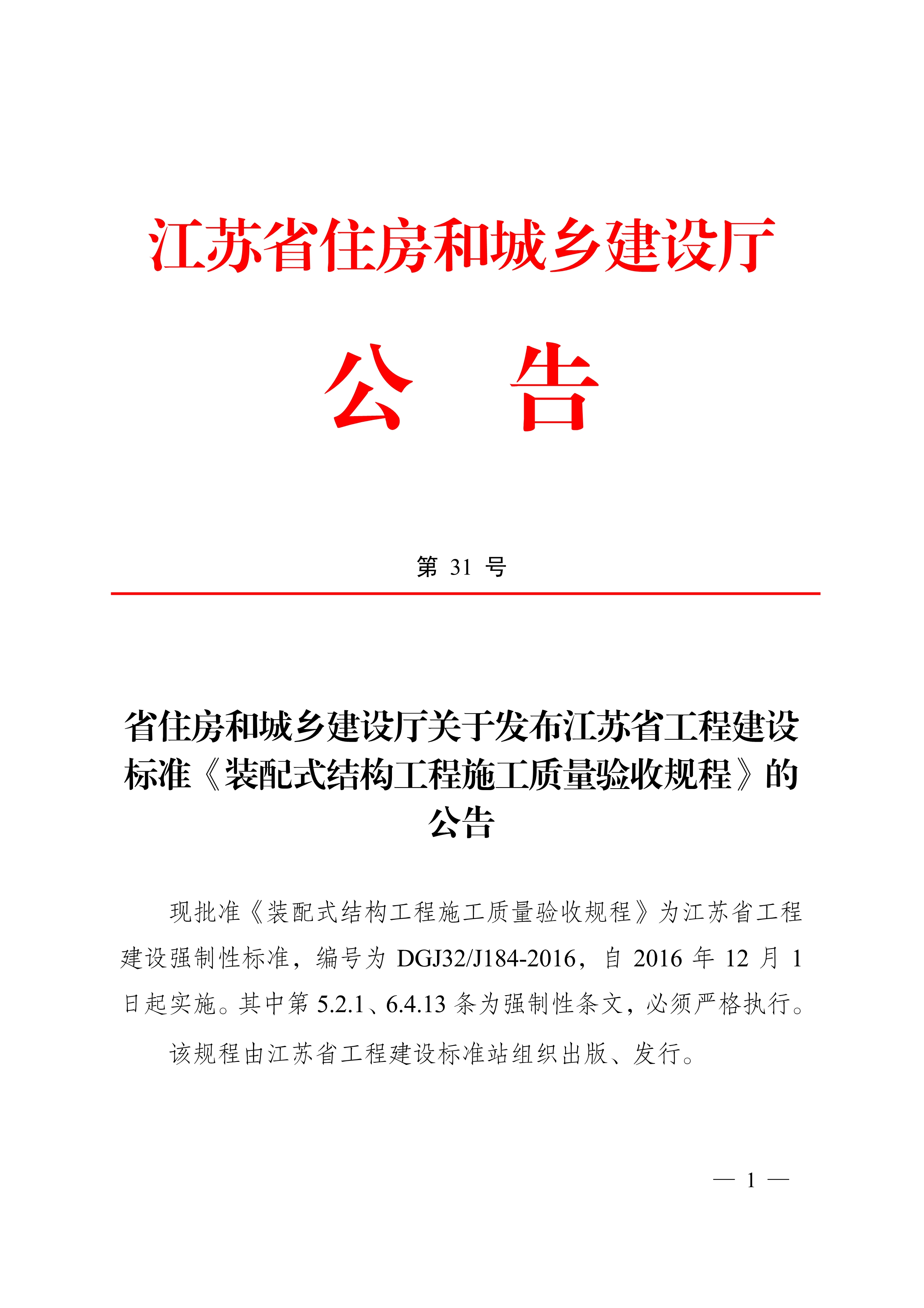 江苏省住房和城乡建设厅关于发布江苏省工程建设标准《装配式结构工程施工质量验收规程》的公告
